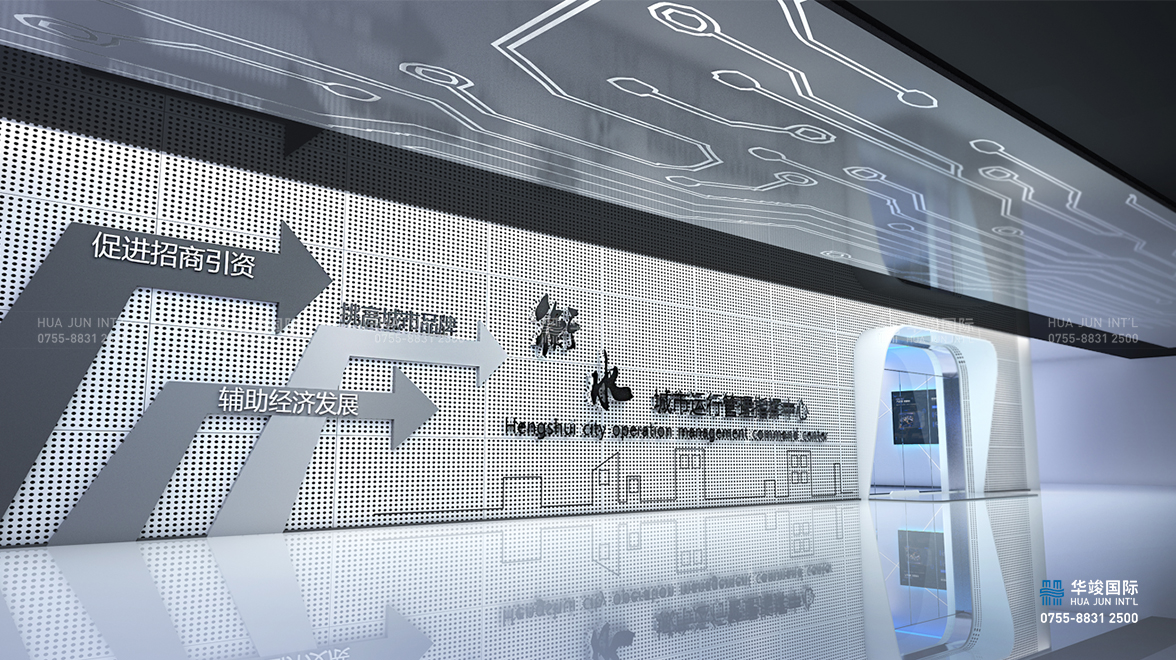 衡水智慧城市運行管理中心展廳主要由入口形象區、指揮大廳、大會議室構成,旨在打造促進衡水市招商引資、輔助經濟發展、提升城市品牌形象的展示窗口。
