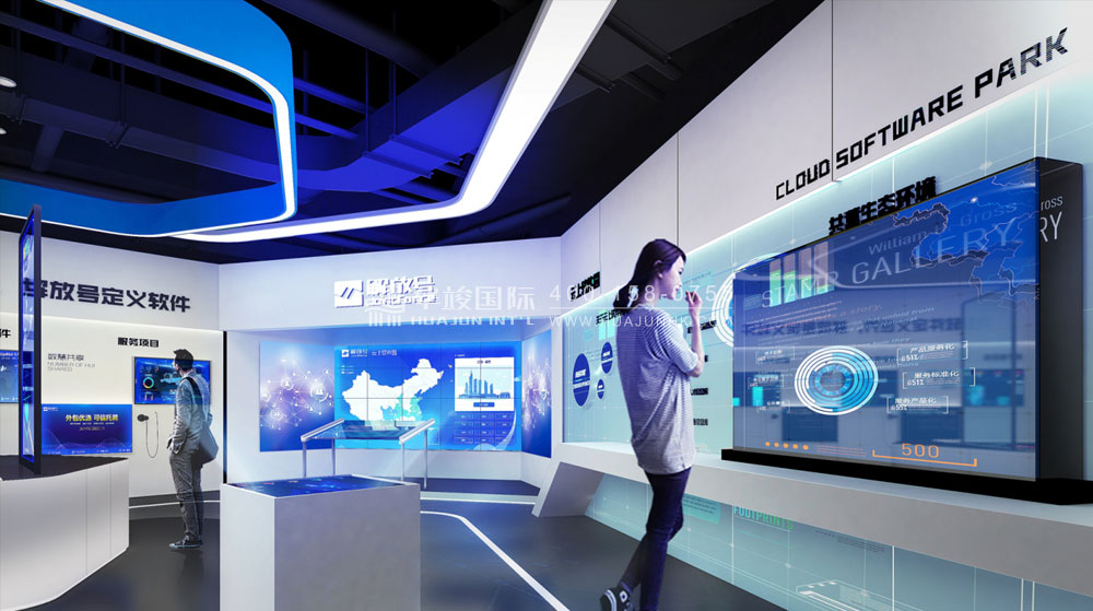 中軟國際企業展廳設計是由華竣國際執行整體設計施工的一項企業展廳案例,從“品牌、產品、文化、科技”四個方向,凸顯企業在行業內的領先地位,結合互動多媒體展示形式,打造人文合一的創新企業展廳案例,讓觀眾切身感受企業的品牌文化。