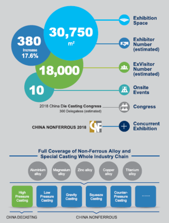 CHINA DIECASTING 2018 and CHNIA NONFERROUS 2018 will be held from July 18 to 20, 2018 in Shanghai New International Expo Centre (SNIEC). The exhibition area will be expanded to 30,750 m2, and the whole platform is expected to upgrade into another level with more values on professional, services, and experience.