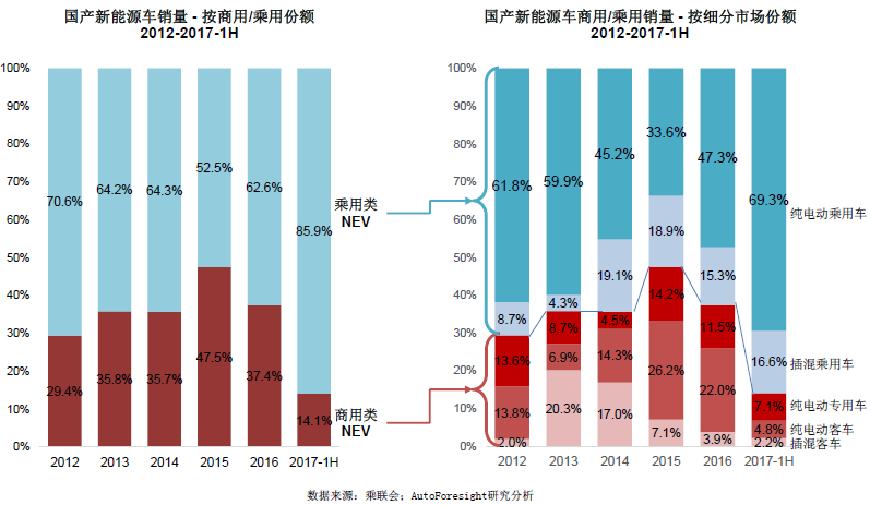 近年來,中國商用類NEV(新能源汽車)一直占30%~40%左右,乘用車NEV占60%~70%。2017年上半年商用類NEV份額下降至14.1%,乘用車EV(電動汽車)上升至85.9%。