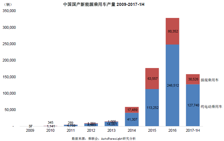 中國2017年上半年新能源乘用車產量達到158,266輛,同期增長31.4%。其中PHEV(插電式混合動力汽車)達到30,526輛,同期下降23.5%。純電EV達到127,740輛,增長58.5%。