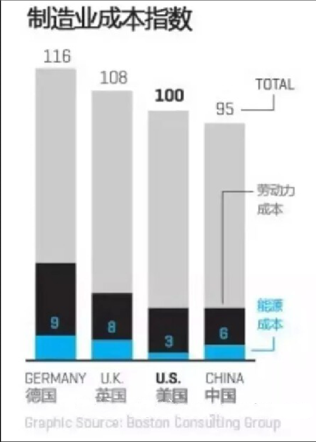 據波士頓咨詢公司估計,現在在美國制造商品的平均成本只比在中國高5%,更令人震驚的是:到2018年,美國制造的成本將比中國便宜2-3%。