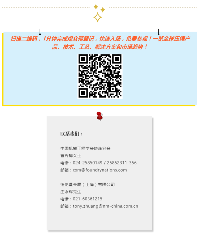 ★ 掃描關(guān)注“壓鑄快訊/有色鑄造”公眾號(hào) —>>點(diǎn)擊菜單“觀眾中心--我要參觀”—>>進(jìn)入觀眾注冊(cè)系統(tǒng)—>>手機(jī)號(hào)/郵箱登錄,填寫(xiě)個(gè)人信息 —>>完成預(yù)登記。